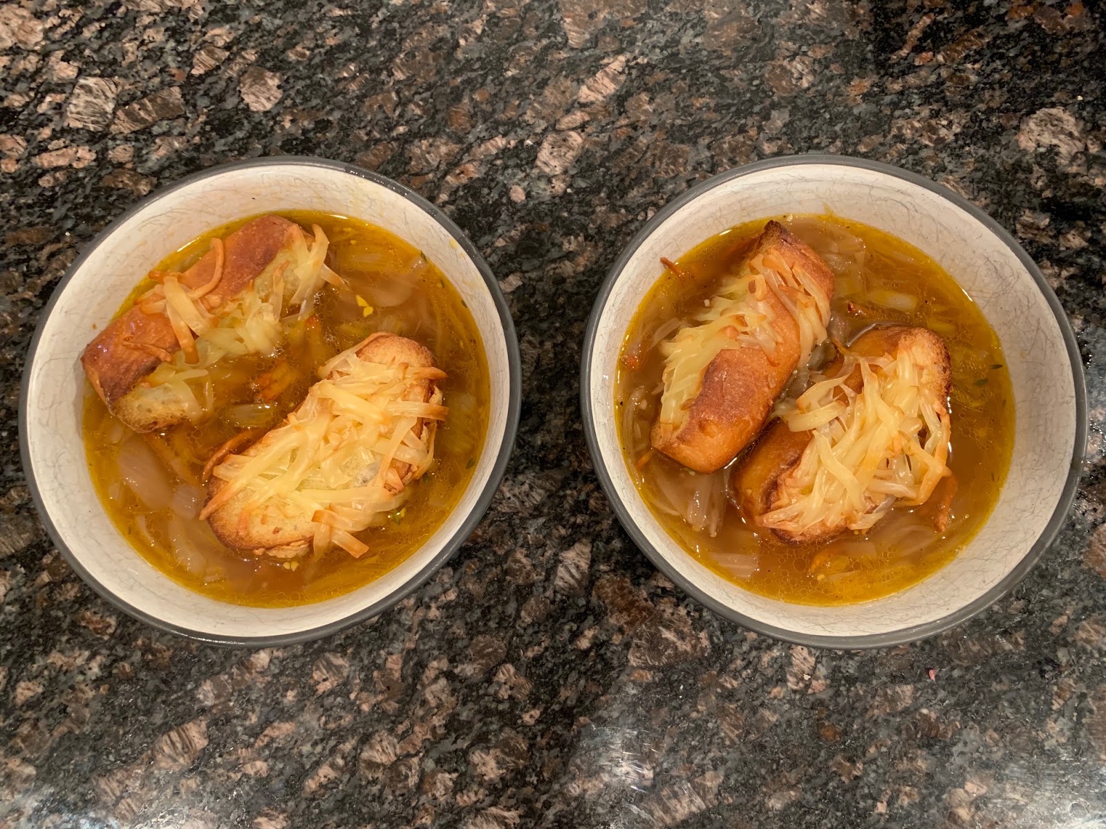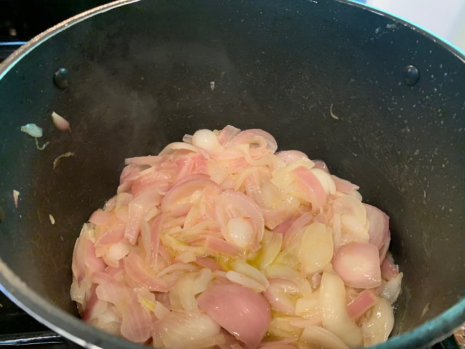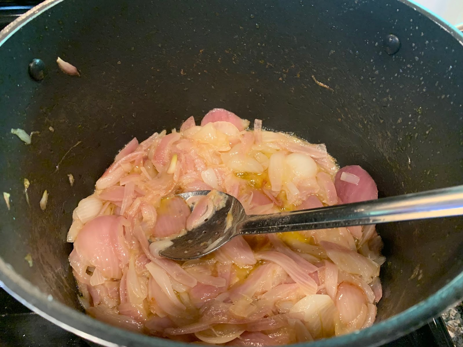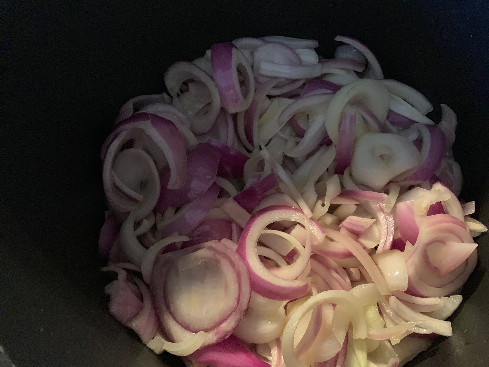 - 6 large red or yellow onions (about 3 pounds), peeled and thinly sliced root to stem