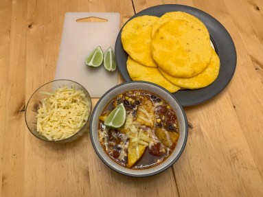 While the soup is on the low simmer, preheat the oven to 450 degrees. Brush both sides of the bread pieces with the remaining olive oil as needed and place them on one side on a sheet pan covered in parchment paper. Cook 7 minutes.